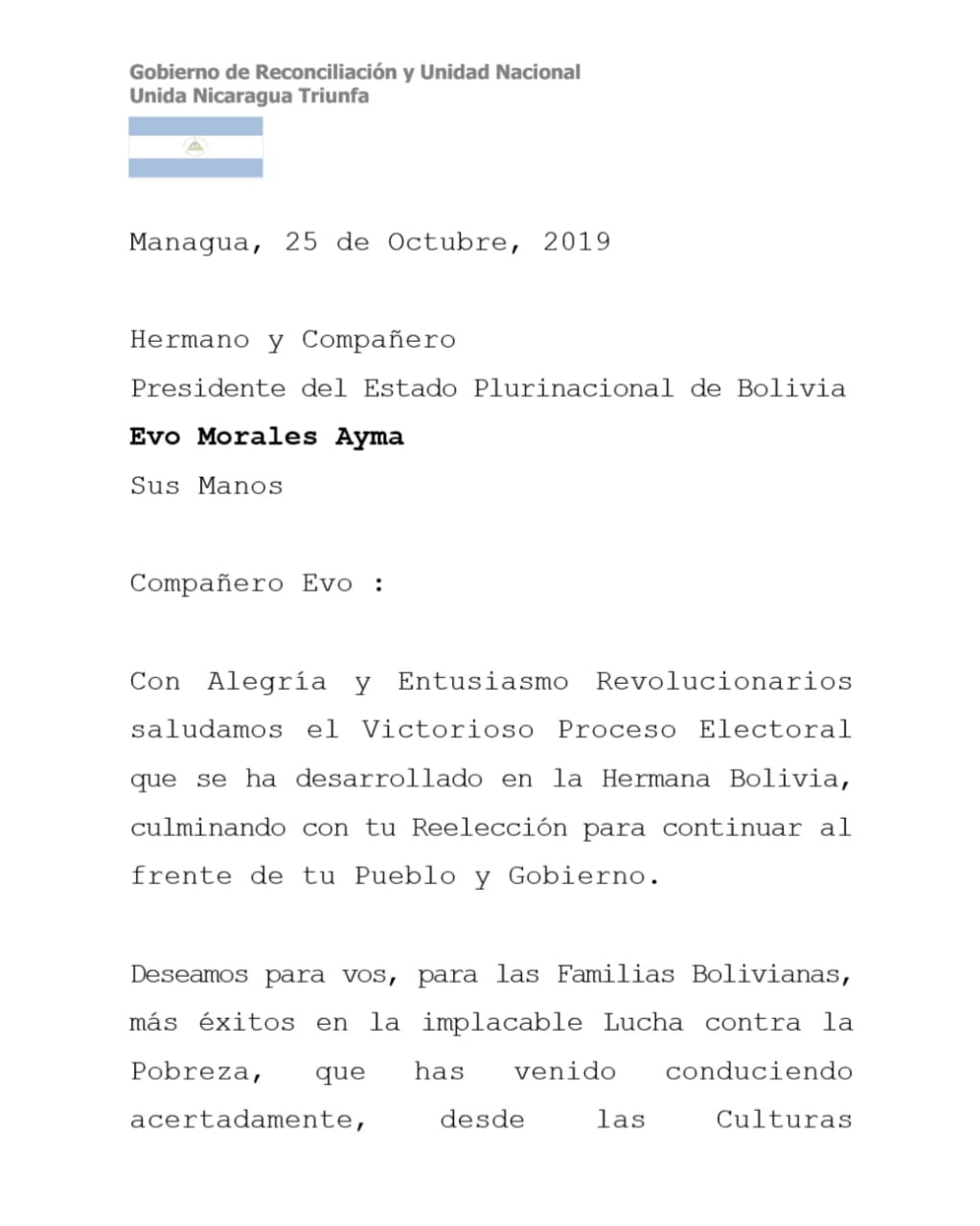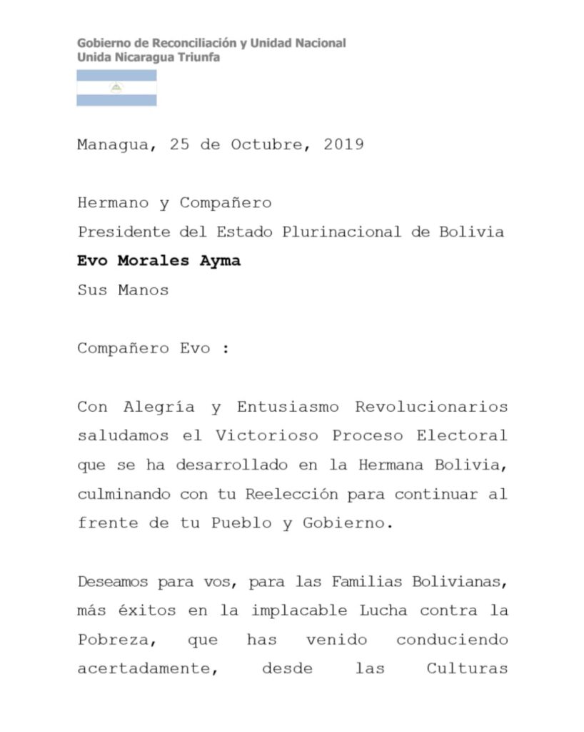 Con Alegría y Entusiasmo Revolucionarios saludamos el Victorioso Proceso Electoral que se ha desarrollado en la Hermana Bolivia, culminando con tu Reelección para continuar al frente de tu Pueblo y Gobierno.