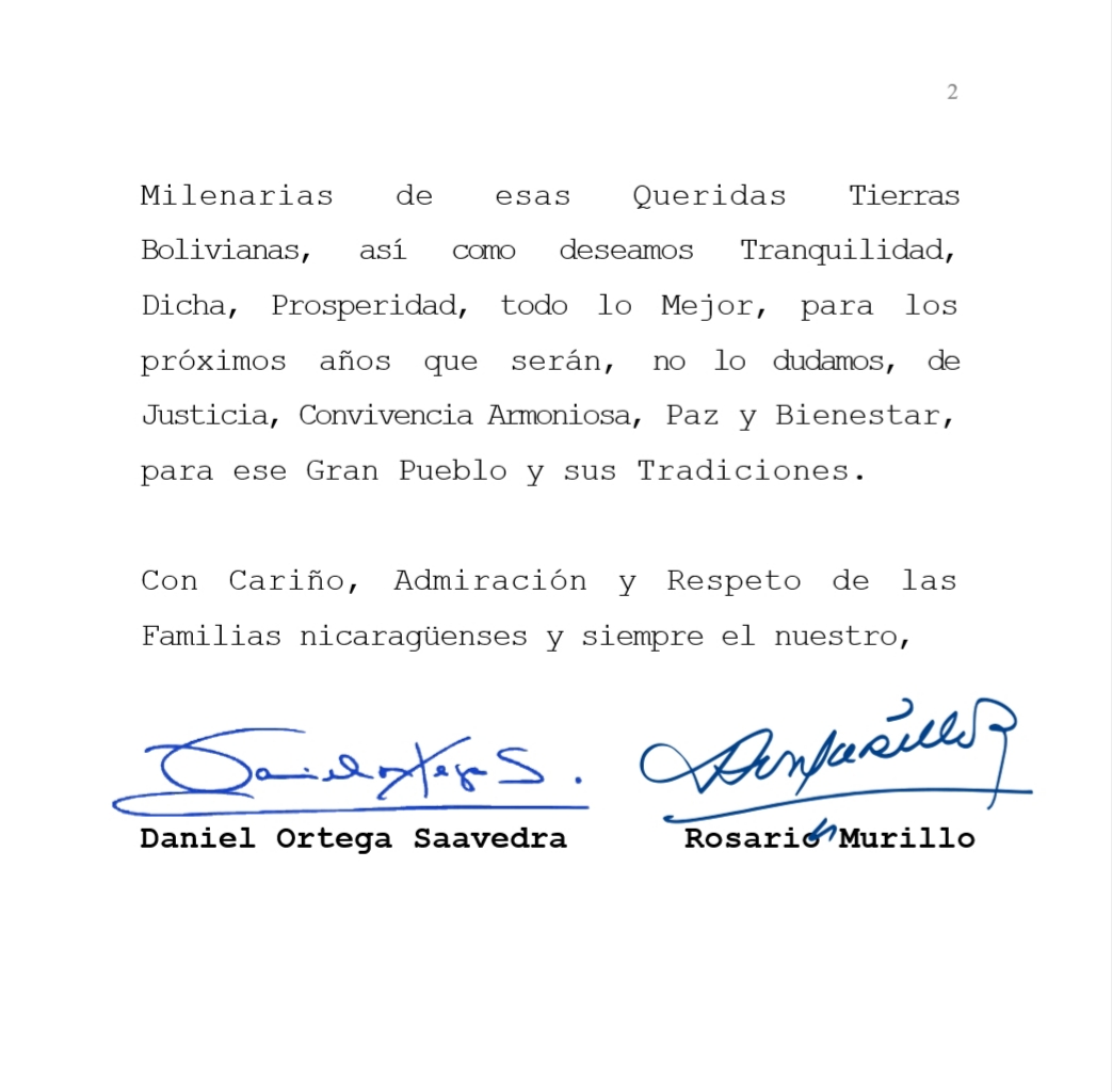 Deseamos para vos, para las Familias Bolivianas, más éxitos en la implacable Lucha contra la Pobreza, que has venido conduciendo acertadamente, desde las Culturas Milenarias de esas Queridas Tierras Bolivianas, así como deseamos Tranquilidad, Dicha, Prosperidad, todo lo Mejor, para los próximos años que serán, no lo dudamos, de Justicia, Convivencia Armoniosa, Paz y Bienestar, para ese Gran Pueblo y sus Tradiciones.